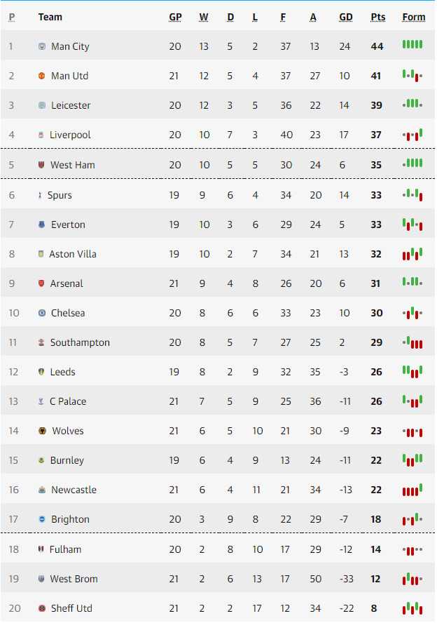 Vòng 21 Ngoại hạng Anh vẫn còn một số cặp đấu đáng chú ý: Chelsea - Burnley (19h, 31/1), West Ham - Liverpool (23h30, 31/1), Brighton - Tottenham (2h15, 1/2). Bảng xếp hạng sẽ còn bị xáo trộn sau khi kết thúc các trận đấu này.