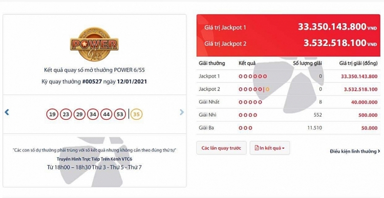 Trước đó, tại kỳ quay số 526 được tổ chức vào tối ngày 9/1 không xác định được chủ nhân của giải Jackpot trị giá 16,5 tỷ đồng cho loại hình Power 6/55 có dãy số may mắn: 10 - 19 - 24 - 29 - 46 - 48/05.