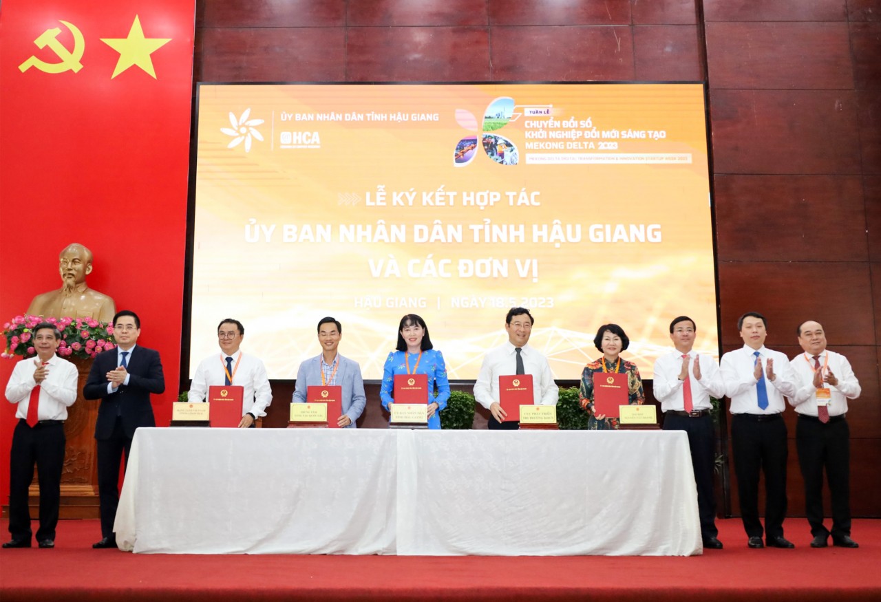 | Các đại biểu thực hiện ký kết hợp tác với UBND tỉnh Hậu Giang về chuyển đổi số. |