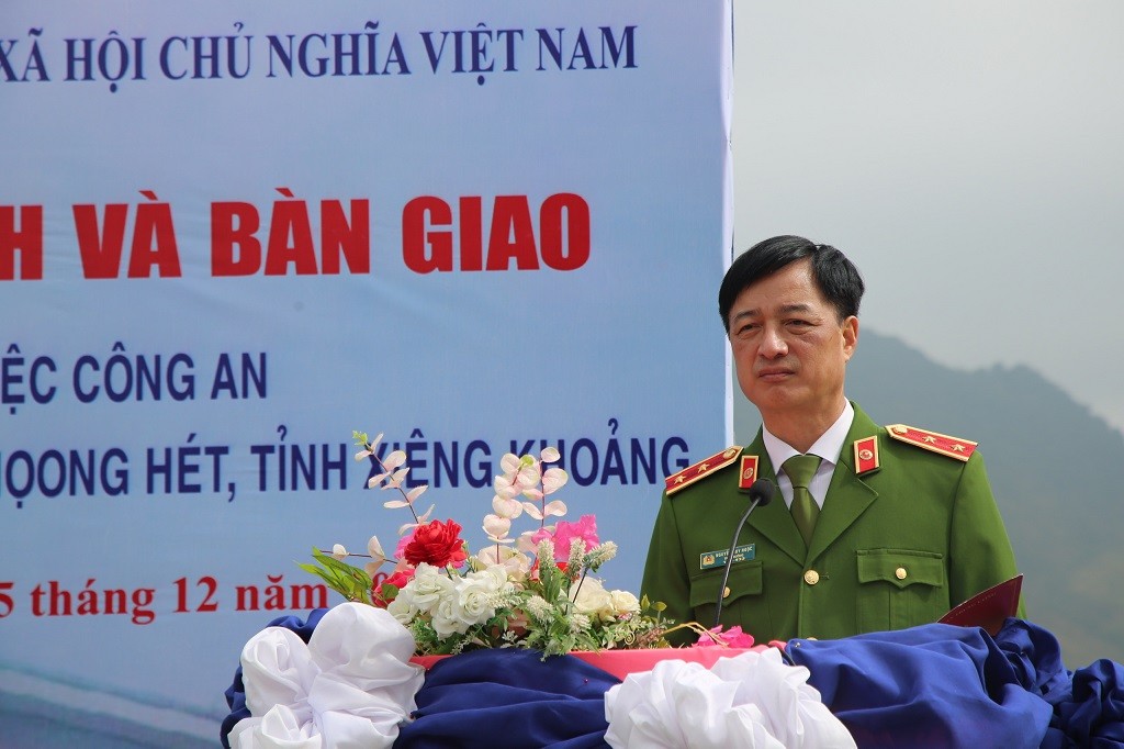Đồng chí Thứ trưởng Nguyễn Duy Ngọc cảm ơn chính quyền tỉnh Nghệ An và tỉnh Xiêng Khoảng đã tạo điều kiện hỗ trợ, giúp đỡ về nhiều mặt để việc xây dựng được thuận lợi và theo đúng tiến độ đề ra; tin tưởng lực lượng Công an 02 tỉnh sẽ tiếp tục phối hợp thực hiện tốt hơn nữa công tác đảm bảo an ninh trật tự tại khu vực biên giới, đấu tranh có hiệu quả với các loại tội phạm, nhất là tội phạm mua bán, vận chuyển trái phép chất ma túy xuyên quốc gia lợi dụng địa bàn Lào và Việt Nam để hoạt động, góp phần giữ gìn sự bình yên của Nhân dân hai nước, củng cố, vun đắp thêm cho tình đoàn kết đặc biệt, hữu nghị truyền thống giữa Việt Nam và Lào.
