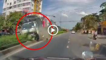 Khoảnh khắc đổ dốc, xe tải đâm vào dải phân cách lật nghiêng xuống đường