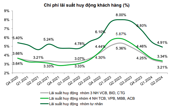 Đối với nhóm ngân hàng thương mại cổ phần tư nhân, áp lực tăng nhẹ lãi suất huy động vẫn còn để tăng cường huy động vốn nhằm thúc đẩy tăng trưởng tín dụng, đặc biệt đối với những ngân hàng có mức độ phụ thuộc vào tiền gửi khách hàng lớn và cơ cấu huy động vốn kém linh hoạt.