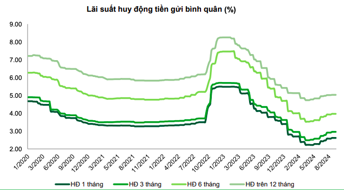 Lãi suất tiền gửi có kỳ hạn trung bình toàn hệ thống tính đến thời điểm giữa tháng 9/2024 tiếp tục tăng thêm 30-50 điểm cơ bản ở hầu hết các kỳ hạn kể từ mức đáy tại thời điểm cuối tháng 4/2024, tuy nhiên vẫn ghi nhận giảm 10-30 điểm cơ bản tùy kỳ hạn so với thời điểm đầu năm 2024.