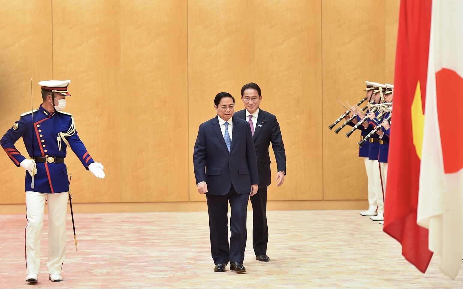 | Thủ tướng Phạm Minh Chính và Thủ tướng Nhật Bản Kishida Fumio duyệt Đội danh dự. Ảnh: VGP/Nhật Bắc |