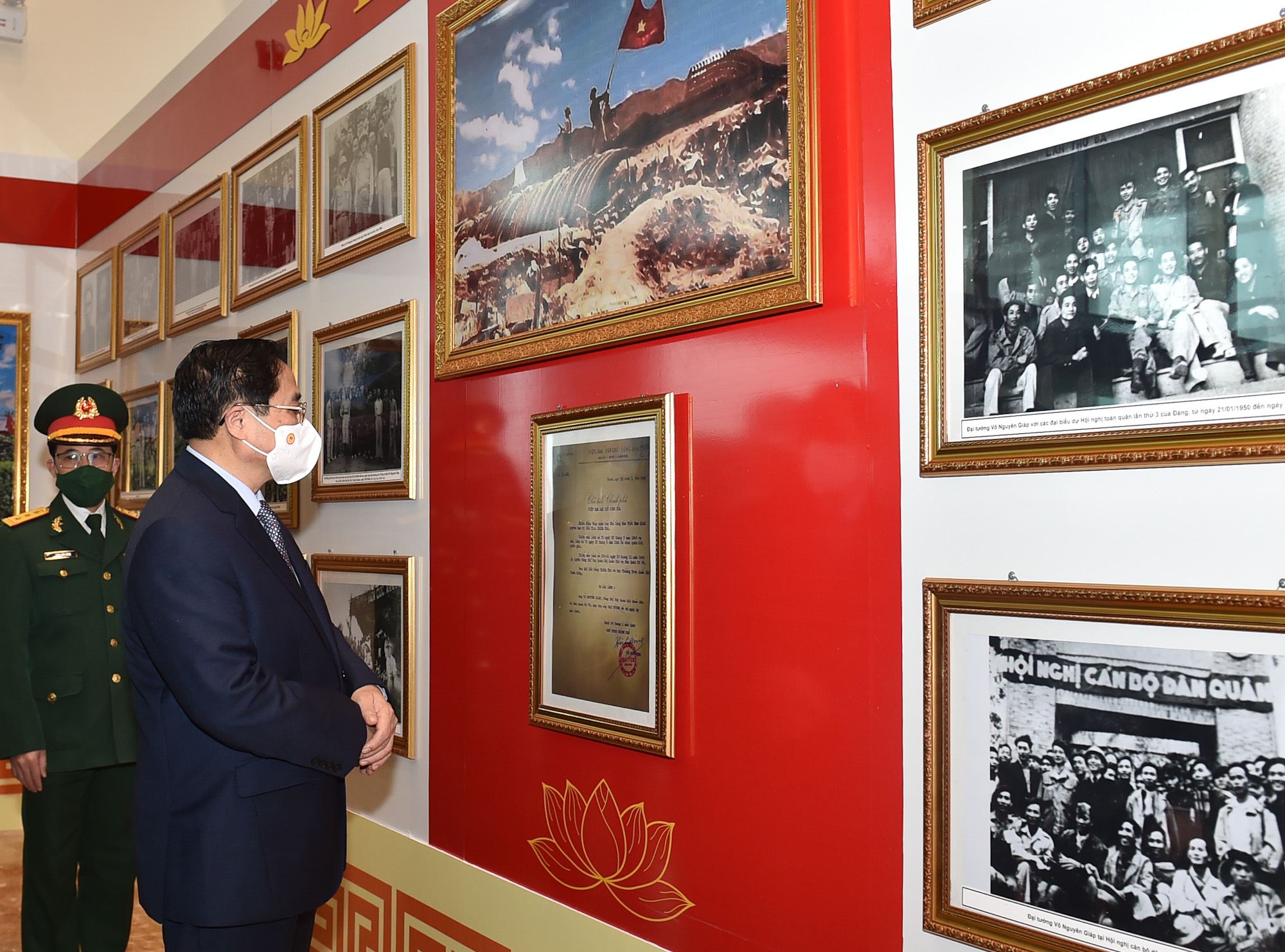 | Thủ tướng xem không gian trưng bày ảnh về cuộc đời và sự nghiệp của đại tướng Võ Nguyên Giáp. Ảnh: VGP/Nhật Bắc |