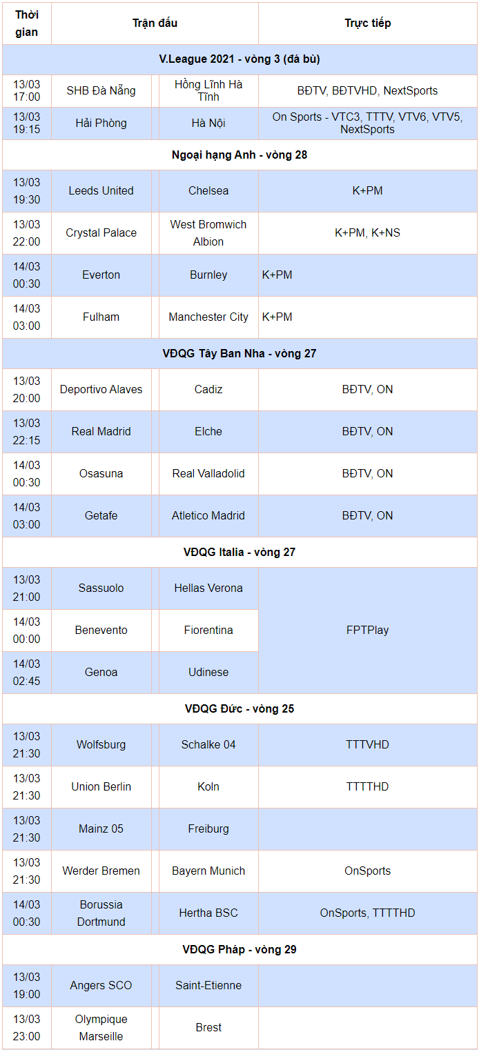 Ngoại hạng Anh cũng diễn ra loạt trận đấu với tâm điểm là cuộc đối đầu giữa Leeds vs Chelsea đá sớm lúc 19h30, 13/3. Man City cũng có chuyến làm khách trước Fulham... Real Madrid và Atletico cũng ra quân ở vòng 27 La Liga 2020/21. Serie A diễn ra các cặp đấu không thực sự nổi trội khi các ông lớn chưa ra trận. Bundesliga lại thu hút bởi những cặp đấu như Werder Bremen vs Bayern Munich hay Borussia Dortmund vs Hertha BSC...
