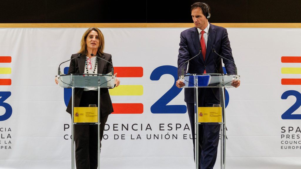 | Bộ trưởng Khí hậu Tây Ban Nha Teresa Ribera (trái) và ông Wopke Hoekstra - Ủy viên EU phụ trách các vấn đề khí hậu trong một cuộc họp