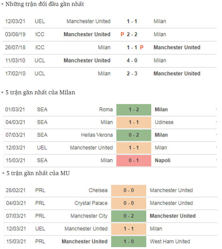 Còn MU được khuyên cẩn trọng trong chuyến hành quân đến sân nhà của AC Milan. Do trước đó, đoàn quân của HLV Solskjaer đã suýt mất điểm nên một chiến thắng có ý nghĩa rất to lớn với họ. Và chuỗi bất bại 5 trận liên tiếp chính là điểm tựa tinh thần để Quỷ Đỏ cụ thể hóa mục tiêu của bản thân.