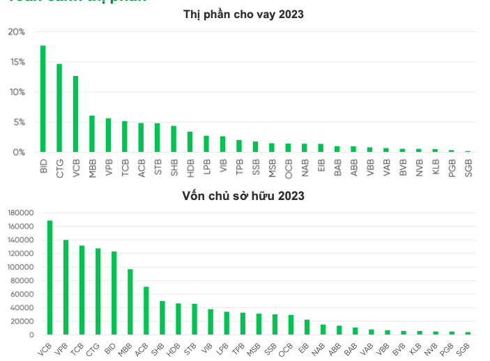 Thị phần cho vay cũng phụ thuộc vào bộ đệm vốn lớn, 13 ngân hàng chiếm thị phần nhiều nhất trong ngành cũng là 13 ngân hàng lớn nhất xét về vốn chủ sở hữu.