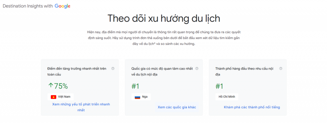 Theo thống kê Google Destination Insights, công cụ theo dõi xu hướng điểm đến, từ tháng 12/2021 đến nay, lượng tìm kiếm về du lịch Việt Nam tăng hơn 75%. Đây là mức tăng cao nhất toàn cầu. Xếp sau Việt Nam là Chile với mức tăng 50-75%. New Zealand, Sri Lanka, Bulgaria, Croatia có các mức tăng trưởng 25-50%. Nhu cầu tìm kiếm tổng thể về du lịch toàn cầu cũng tăng 56% so với cùng kỳ năm ngoái.