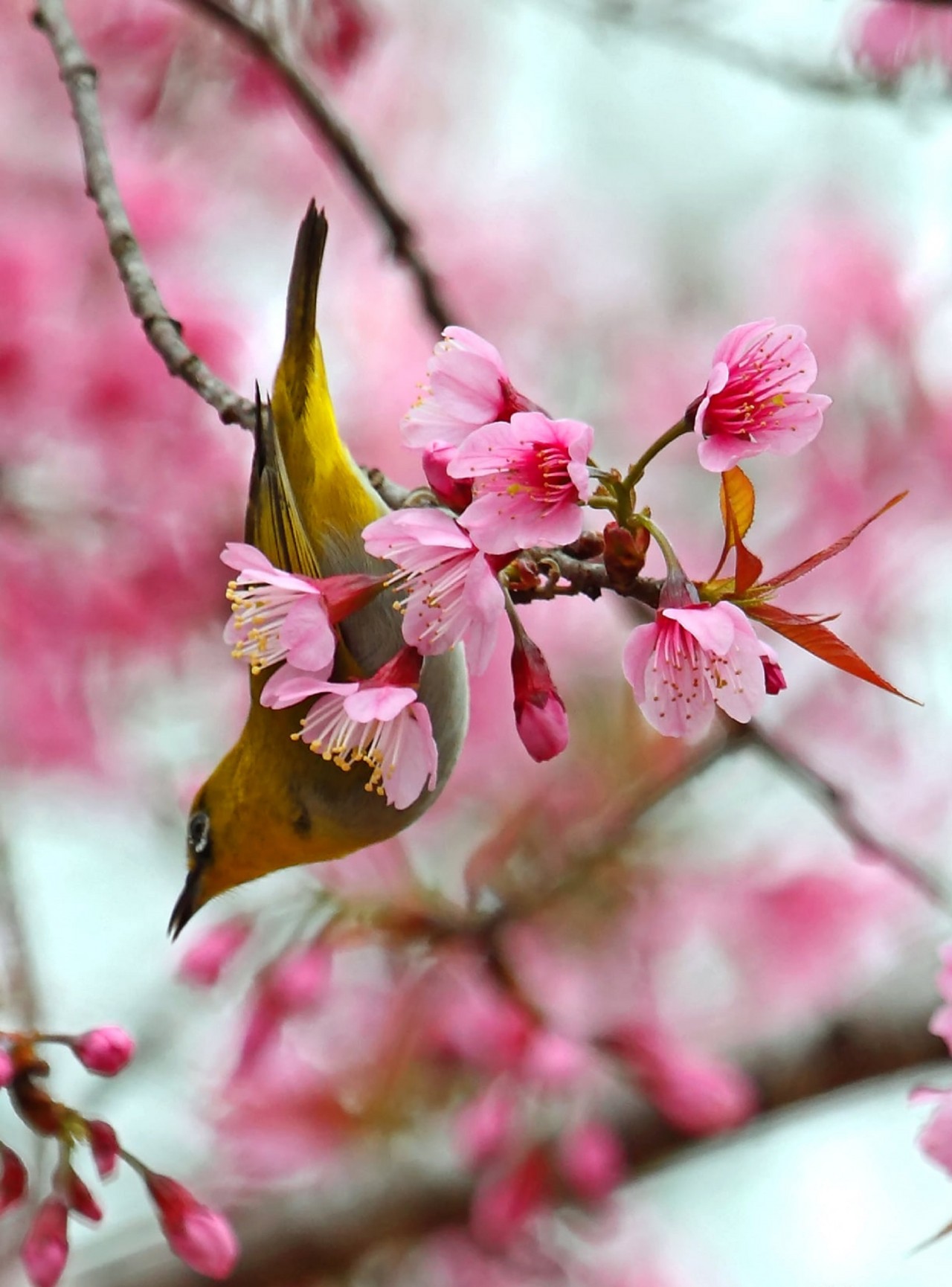| Những chú chim nhỏ trong sắc hồng của hoa đào Măng Đen. (ảnh Đinh Dũng) |