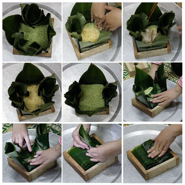 Xếp lá: giống y như xếp để gói bằng tay! Xếp mặt trái của hai lá dong để đè lên nhau như hình, tiếp đó bạn đặt ngang mặt xanh của một lá dong khác lên hai lá xếp dọc. Thêm một lá dong mặt xanh để xếp dọc, các lá chồng lên nhau và úp ngược khuôn trong vào trước này.