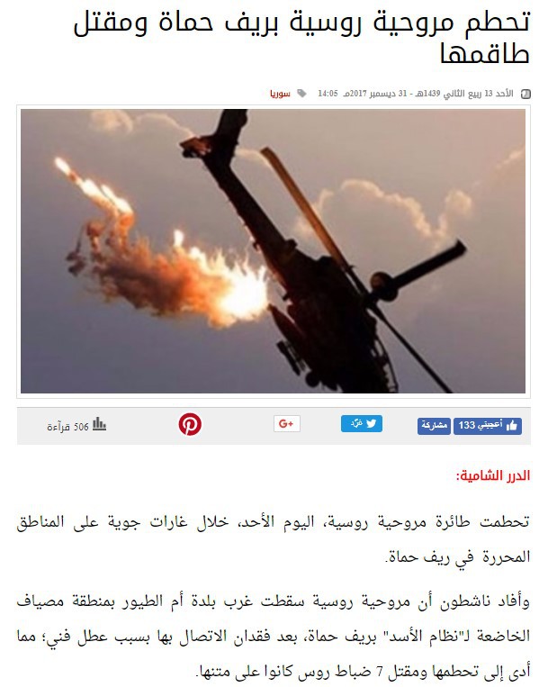 Theo đó, hôm nay, ngày 31/12/2017, ngày cuối cùng trong năm, một máy bay trực thăng quân sự của Nga đã bị rơi ở vùng nông thôn phía bắc Hama vì lý do kỹ thuật. Thậm chí, một số nguồn tin còn đi xa hơn, khẳng định rằng có ít nhất 7 binh sĩ Nga thiệt mạng trong vụ tai nạn này.