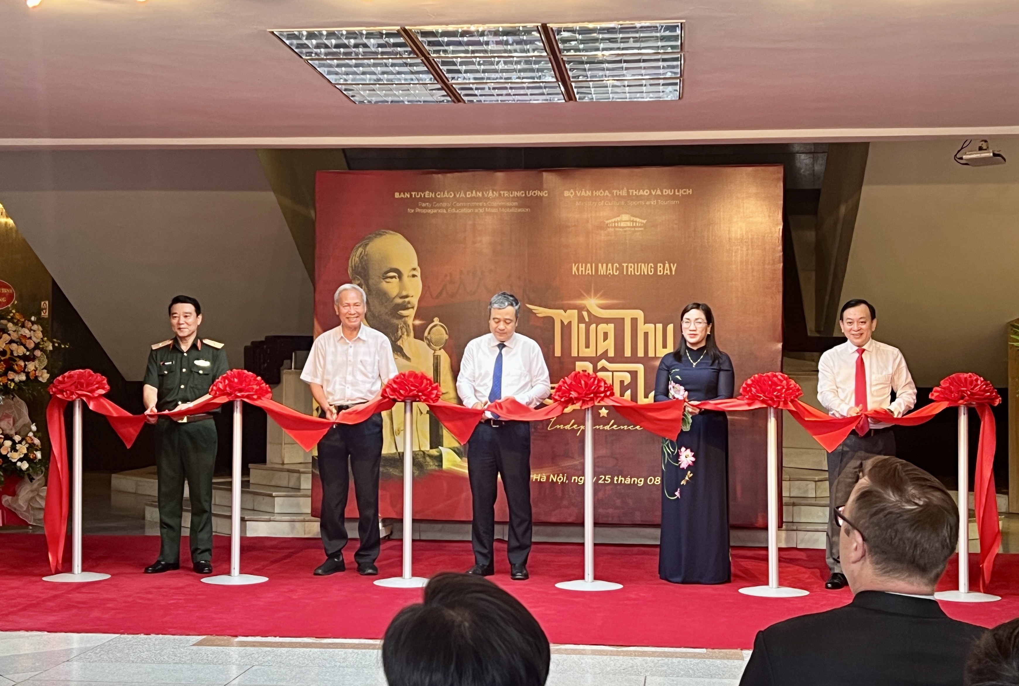 Các đại biểu cắt băng khai mạc Trưng bày chuyên đề "Mùa thu độc lập". (Ảnh: Mai Anh) |