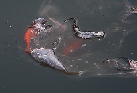 | Cá chép vàng chết nằm lẫn cùng với rác thải trong vợt rác của công nhân vệ sinh môi trường. (Ảnh: Tiền Phong). |