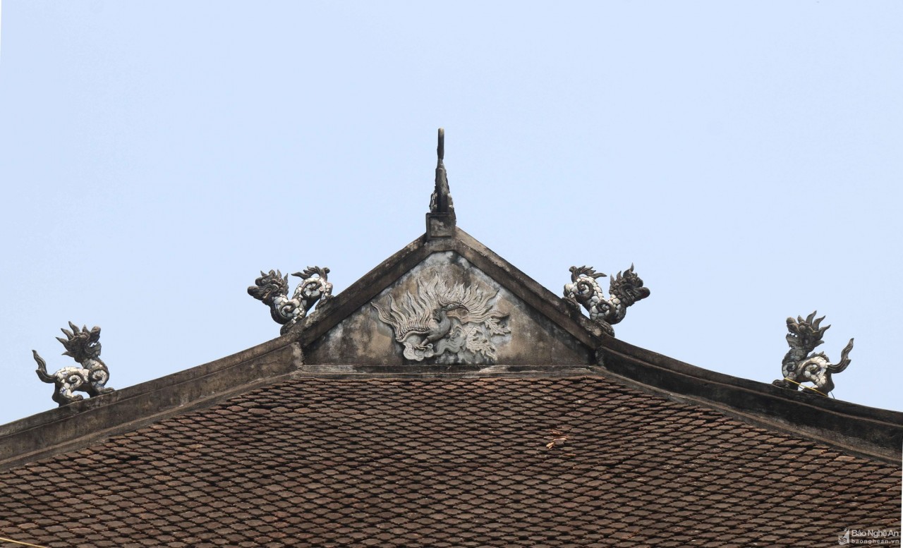 | Ngoài hình lưỡng long triều nguyệt, 2 đầu bờ nóc còn có hình 2 con cá sấu hướng về giữa đình, trên mỗi bờ giải có 2 con nghê quay đầu vào nhau rất sinh động, 4 đầu đao cong vút với hình cá hóa rồng cách điệu. Riêng bờ đốc đắp hình chim phượng xòe cánh với dáng vẻ thanh thoát... Không chỉ độc đáo trong kiến trúc, điêu khắc, đình Phượng Lịch còn là chứng tích của nhiều sự kiện lịch sử quan trọng ở địa phương. Đình đã được công nhận là Di tích Lịch sử cấp tỉnh. Ảnh: Huy Thư |