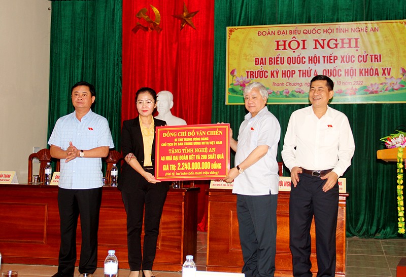 Sáng 11/10, tại xã Thanh Long, huyện Thanh Chương (Nghệ An), trước khi tiếp xúc cử tri huyện Thanh Chương trước kỳ họp thứ 4, Quốc hội khóa XV, Bí thư Trung ương Đảng, Chủ tịch Ủy ban Trung ương Mặt trận Tổ quốc Việt Nam Đỗ Văn Chiến đã trao tặng tỉnh Nghệ An 40 nhà đại đoàn kết và 200 suất quà với tổng trị giá 2.240 triệu đồng; trao tặng huyện Thanh Chương 10 nhà đại đoàn kết và 50 suất quà với tổng trị giá 560 triệu đồng; và tặng quà cho 10 hộ bị ảnh hưởng nặng do ảnh hưởng của hoàn lưu cơn bão số 4 vừa qua.