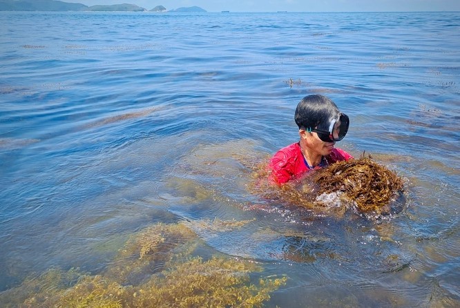 "Rong mơ thân mềm, thường phát triển ở độ sâu 0,5-3m, muốn lấy được phải vất vả ngụp lặn hàng giờ đồng hồ dưới biển. Sáng nay tôi vớt được gần 3 tạ, phơi khô cũng được vài yến rong mơ. Giá trung bình thương lái thu mua 7.000 đồng/kg thì chỉ mất một lúc vào buổi sáng, tôi cũng kiếm được gần 2 triệu đồng", ông Vinh nói.