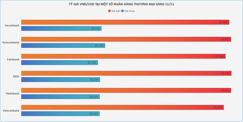 Techcombank giá USD đang niêm yết ở mức 25.130 - 25.475 VND/USD, giảm 10 đồng ở chiều mua và 16 đồng ở chiều bán so với phiên trước. Trong khi Sacombank giá USD điều chỉnh giảm 40 đồng ở chiều mua và 21 đồng ở chiều bán, đang niêm yết ở mức 25.120 - 25.470 VND/USD.