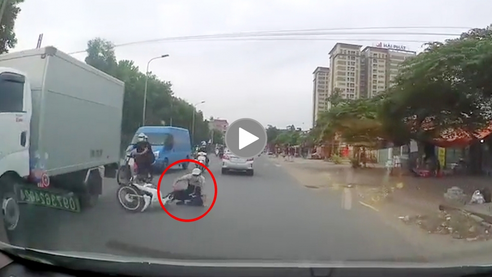 Tài xế chiếc xe tải đã phải phanh gấp để tránh một con chó thả rông bất ngờ chạy băng qua đường, khiến người đi xe máy ở ngay phía sau không kịp xử lý và trượt ngã, suýt chút nữa đã bị chiếc xe có gắn camera hành trình chạy đến từ hướng ngược chiều tông phải.