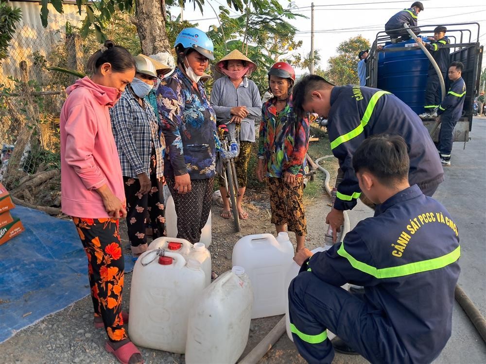 | Ngày 15/4, tại ấp Nam Chánh, xã Lịch Hội Thượng, huyện Trần Đề (tỉnh Sóc Trăng), Công an tỉnh đã trao 150 thùng nước suối loại 21 lít/thùng; 150 lốc nước đóng chai cho bà con. Bên cạnh đó, Phòng Cảnh sát Phòng cháy chữa cháy& Cứu nạn cứu hộ Công an tỉnh Sóc Trăng tăng cường 2 xe bồn chở nước sinh hoạt hỗ trợ người dân với số lượng gần 10m3. (Ảnh: CAND) |
