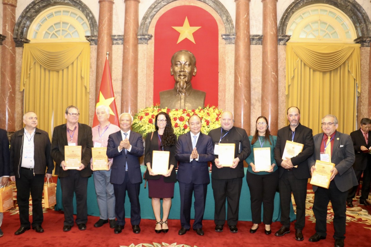 | Chủ tịch nước Nguyễn Xuân Phúc chụp ảnh lưu niệm với đoàn đại biểu dự Đại hội lần thứ 22 Hội đồng Hòa bình thế giới. (Ảnh: Thu Hà) |