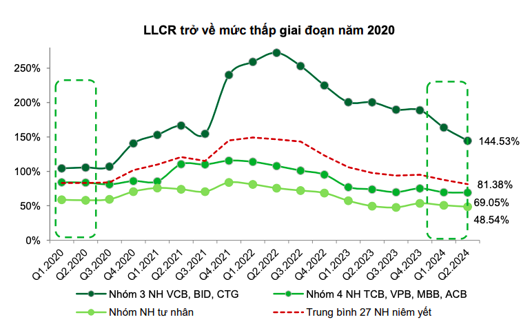 Bộ đệm dự phòng của toàn ngành ngân hàng tiếp tục thu hẹp trong nửa đầu năm 2024 với tỷ lệ bao phủ nợ xấu LLCR trung bình toàn ngành giảm về mức thấp nhất trong giai đoạn từ đầu năm 2020 đến nay, làm hạn chế khả năng xử lý nợ trong thời gian tới, đặc biệt đối với những ngân hàng có tệp khách hàng rủi ro cao và có tỷ lệ nợ tái cơ cấu /tổng dư nợ cao.