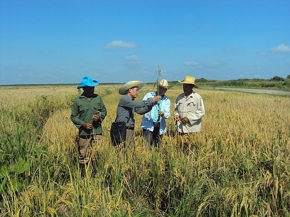 | Chuyên gia hai nước đang trao đổi kỹ thuật trong khuôn khổ Dự án trồng lúa tại Cuba. |