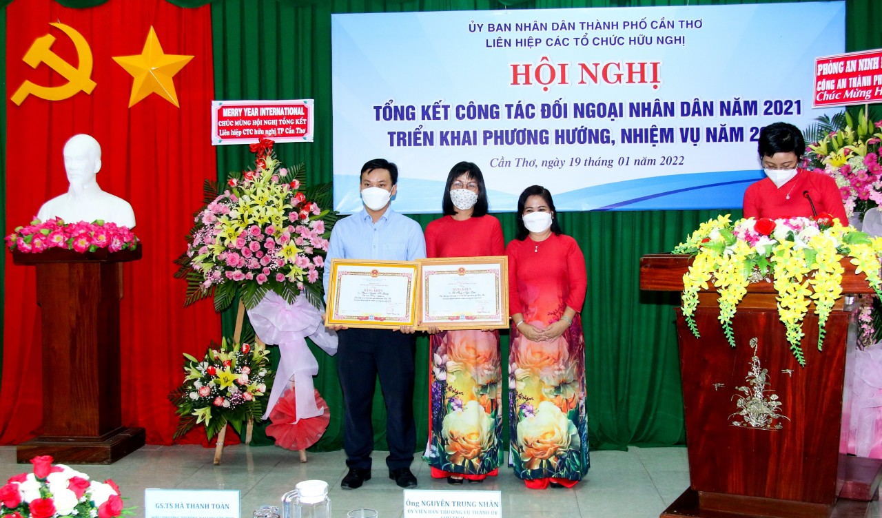 | Với nhiều thành tích đóng góp cho công tác Hòa bình - Đoàn kết - Hữu nghị năm 2021, Đoàn Chủ tịch VUFO đã tặng Cờ thi đua Đơn vị dẫn đầu phong trào thi đua năm 2021 cho Liên hiệp Cần Thơ. |