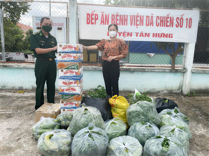 Thiếu tá Nguyễn Xuân Linh, Chính trị viên Đồn Biên phòng Sông Trăng, BĐBP Long An trao các phần quà cho Bệnh viện dã chiến số 10 huyện Tân Hưng để hỗ trợ cho các bệnh nhân nhiễm Covid-19 đang điều trị tại đây. Ảnh: Đình Quân