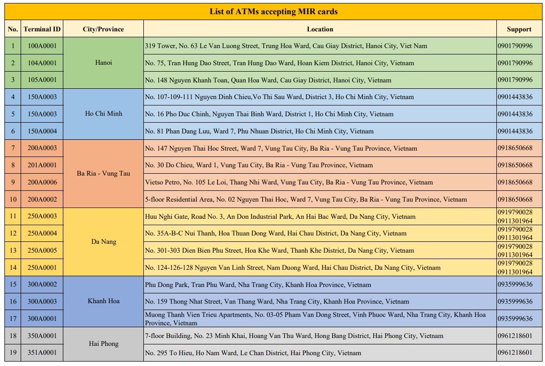 Du khách Nga đến Việt Nam có thể rút tiền mặt VND bằng thẻ Nga (thẻ MIR) tại máy ATM của VRB. Theo danh sách được VRB công bố trên website chính thức, có 19 điểm ATM tại Việt Nam chấp nhận giao dịch MIR: