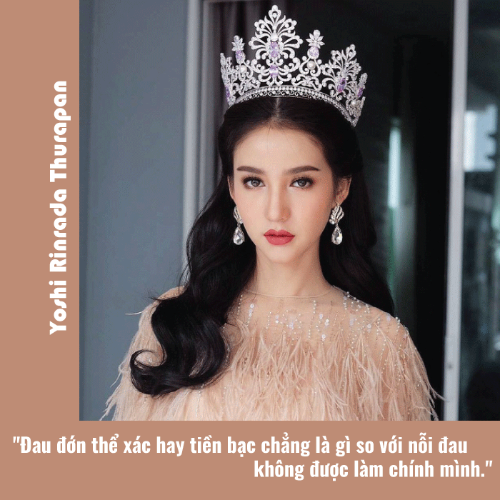 Hoa hậu chuyển giới Yoshi Rinrada Thurapan cũng từng chia sẻ với báo giới về hành trình tìm lại chính mình rằng: "Đau đớn thể xác hay tiền bạc chẳng là gì so với nỗi đau không được làm chính mình."