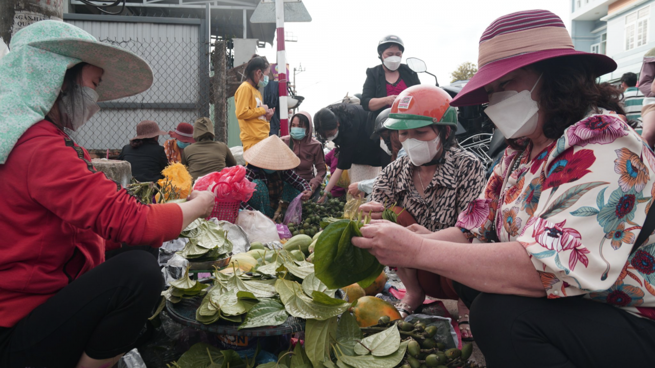 | Người dân ở Bình Định đi chợ Gò vào sáng mùng 1 Tết để mua trầu, cau. Nguồn: Hoàng Trọng/ Thanh Niên |