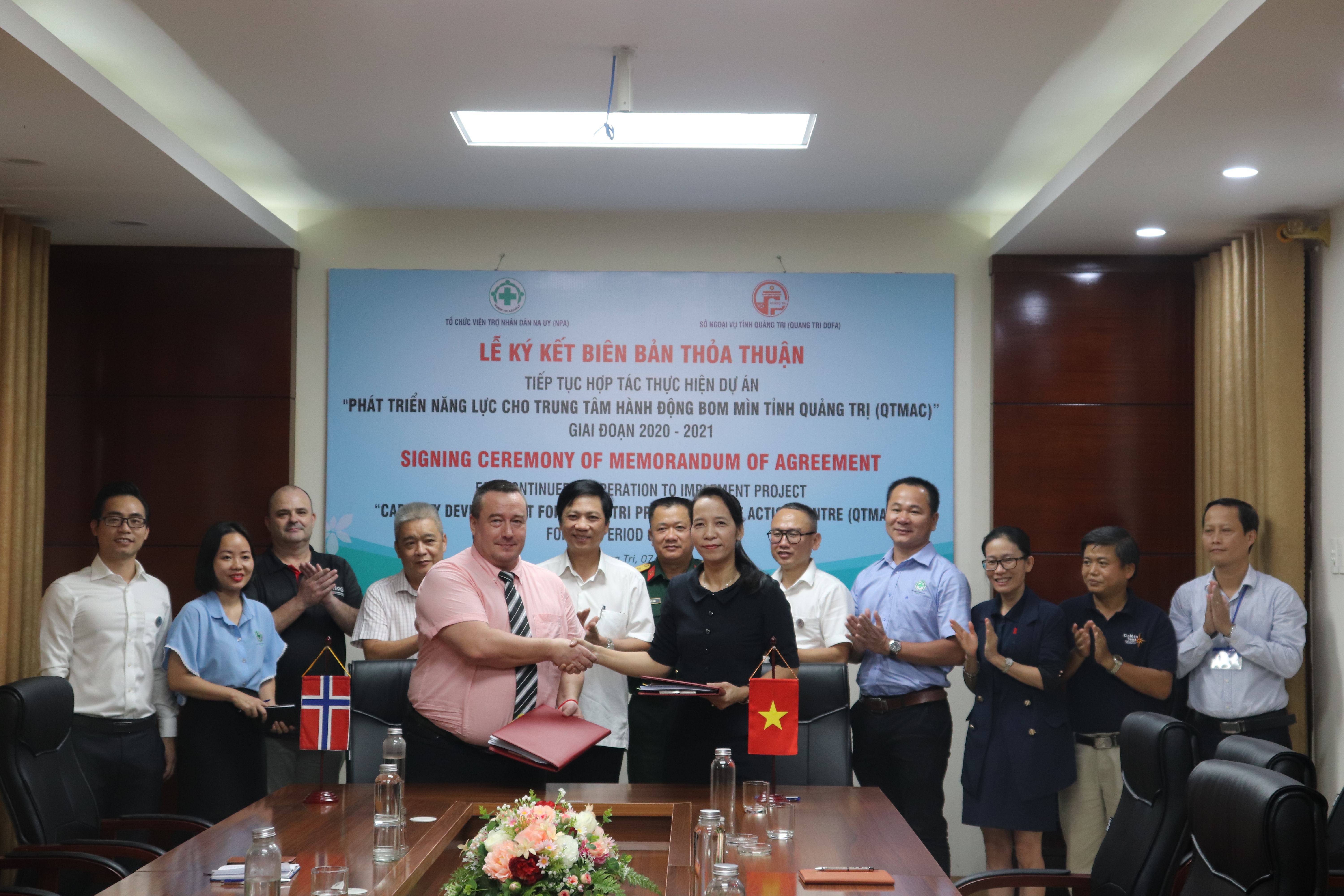 Từ thành công của giai đoạn 1 (2018 – 2020) Dự án “Phát triển năng lực cho Trung tâm Hành động bom mìn tỉnh Quảng Trị” (QTMAC) và sự cam kết tài trợ của Bộ Phát triển quốc tế Vương quốc Anh (DFID), Sở Ngoại vụ Quảng Trị và tổ chức Viện trợ Nhân dân Na Uy (NPA) tiến hành ký kết Biên bản thỏa thuận về việc tiếp tục hợp tác thực hiện Dự án QTMAC giai đoạn 2020 - 2021. Phó Chủ tịch Uỷ ban nhân dân tỉnh Hoàng Nam và Giám đốc Quốc gia NPA Jan Erik Stoat tham dự buổi ký kết.