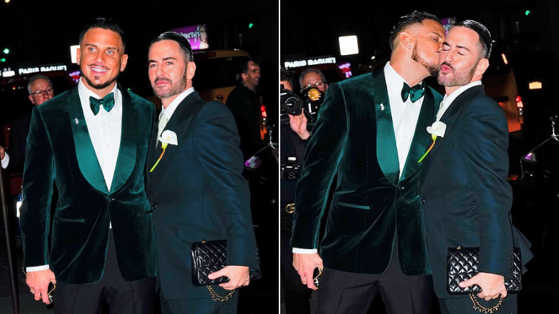 | Marc Jacobs diện vest đơn giản màu xanh navy, cà vạt trắng cùng cài áo hoa bách hợp. Trong khi đó, người mẫu – diễn viên Char Defrancesco chọn bộ suit màu xanh lá mạ bằng nhung sang trọng.(Ảnh: Dailymail) |