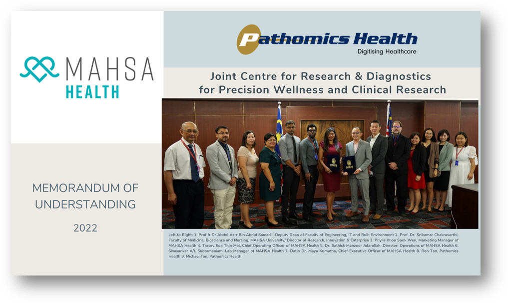 Với sự hợp tác mới nhất với MAHSA, Pathomics Health sẽ cung cấp cho công chúng Malaysia và khách du lịch y tế đến thăm Malaysia quyền truy cập vào các công cụ sàng lọc sức khỏe tiên tiến ngoài các dịch vụ xét nghiệm hồ sơ gen được cung cấp trên mạng lưới y tế MAHSA gồm các phòng khám chăm sóc chính và bệnh viện. Pathomics health và MAHSA cam kết cải thiện dịch vụ chăm sóc sức khỏe ban đầu và thúc đẩy các giới hạn của nghiên cứu lâm sàng cũng như các giải pháp chăm sóc sức khỏe kỹ thuật số tiên tiến chính xác, sàng lọc bệnh truyền nhiễm và dược động học.