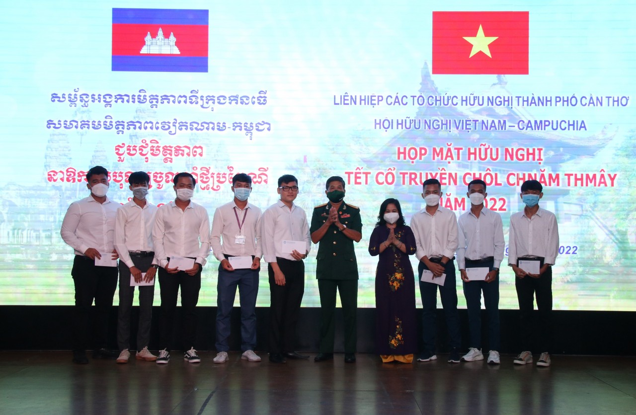 | Chủ tịch Liên hiệp các tổ chức hữu nghị TP Cần Thơ và Chủ tịch Hội hữu nghị Việt Nam - Campuchia tại TP Cần Thơ trao học bổng cho các em sinh viên Campuchia đang học tập tại TP Cần Thơ. |