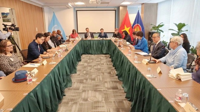 | Cuộc gặp giữa Đoàn đại biểu Ban Đối ngoại Trung ương với đại diện các tổ chức, phong trào cánh tả Mỹ. (Ảnh: Thanh Tuấn/TTXVN) |
