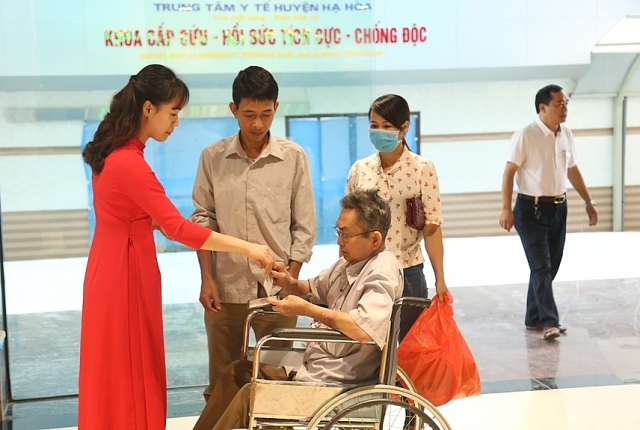 | Nhân viên Trung tâm y tế huyện Hạ Hòa trao thẻ cho người dân khám theo yêu cầu tại Trung tâm khám chữa bệnh chất lượng cao (Ảnh: TTYT Hạ Hòa). |