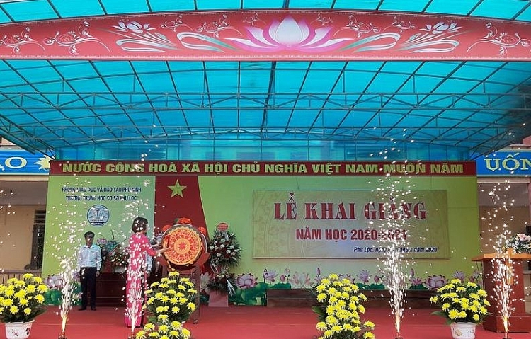 | Cô giáo Nguyễn Thị Huế - Hiệu trưởng trường THCS Phú Lộc đánh trống Khai giảng năm học 2020 - 2021. |