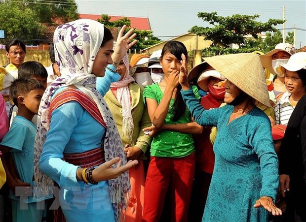 | Nữ du khách Italia làm quen với điệu múa Chăm trong Lễ hội Katê của đồng bào Chăm theo đạo Bà La Môn tỉnh Ninh Thuận ngày 15/10/2012 (Ảnh: Thanh Hà/TTXVN). |