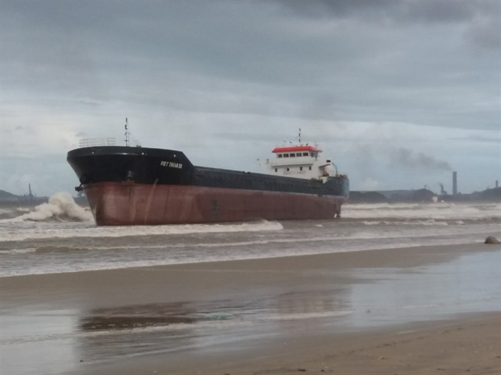 | Tàu Việt Thuận 09 đang bị mắc cạn tại bờ biển Khe Hai (xã Bình Thạnh, Bình Sơn, Quảng Ngãi). Ảnh: Văn Tánh |