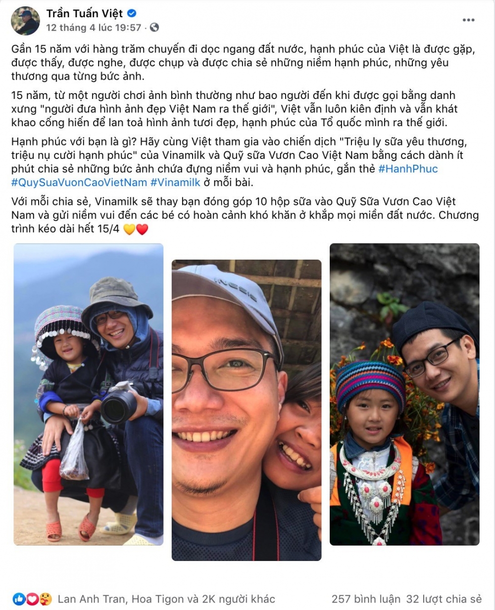 Anh Trần Tuấn Việt (Hà Nội), một nhiếp ảnh gia nổi tiếng thường được gọi là "người đưa hình ảnh đẹp Việt Nam ra thế giới", cho biết trong gần 15 năm đi dọc ngang đất nước, hạnh phúc của anh là được gặp, được thấy, được nghe, được chụp, được chia sẻ niềm hạnh phúc qua từng bức ảnh. Hơn ai hết, anh hiểu một tấm ảnh chứa đựng niềm vui và tình yêu có thể lan tỏa nguồn năng lượng tích cực như thế nào. Có lẽ chính sự đồng điệu đó đã khiến anh Việt nhanh chóng tham gia chiến dịch “Triệu ly sữa yêu thương, triệu nụ cười hạnh phúc”, đồng thời không quên kêu gọi sự hưởng ứng của mọi người xung quanh để cùng nhau góp sữa đến trẻ nhỏ.