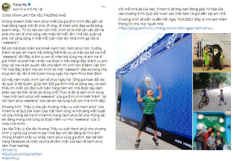 Còn theo Nhà văn Trang Hạ chia sẻ thì khoảnh khắc hạnh phúc của gia đình chị luôn gắn liền với các hoạt động ngoài trời, khi các con của chị được trải nghiệm về cuộc sống và qua đó, cũng vun đắp tình cảm gia đình. “Cùng mình lan tỏa yêu thương nhé!” là điều nữ nhà văn này kêu gọi mọi người hãy ủng hộ chiến dịch “Triệu ly sữa yêu thương, triệu nụ cười hạnh phúc” để niềm vui được lan tỏa đến với các em nhỏ qua những hộp sữa được trao đi. Đó là một trong rất nhiều những câu chuyện về hạnh phúc đã được chia sẻ trong 3 tuần qua để ủng hộ chiến dịch của Vinamilk.