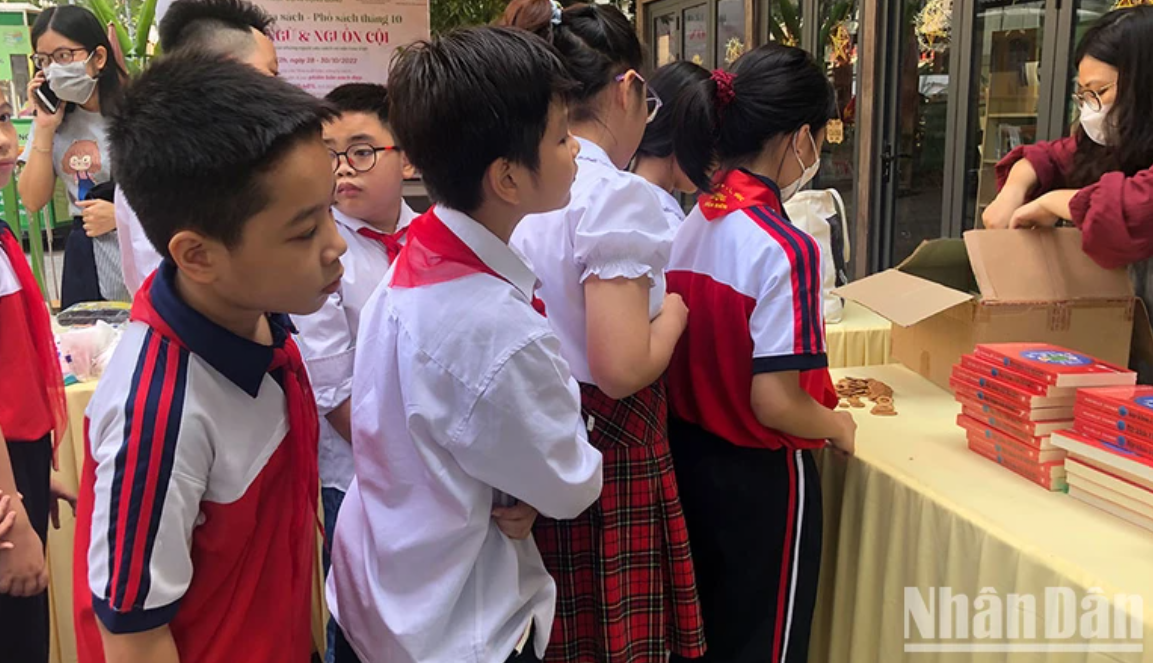 | Bạn đọc nhỏ tuổi xếp hàng chờ nhận sách tặng tại Ngày Sách và Văn hóa đọc Việt Nam 2023. (Ảnh: Báo Nhân dân) |