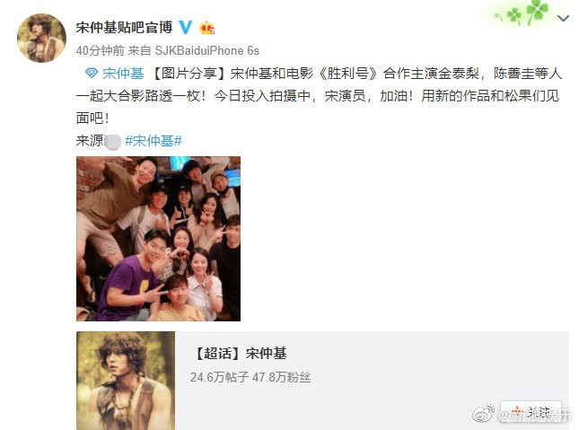 | Hình ảnh Song Joong Ki tươi cười cùng thành viên đoàn làm phim được fanpape Trung Quốc của nam diễn viên chia sẻ. |