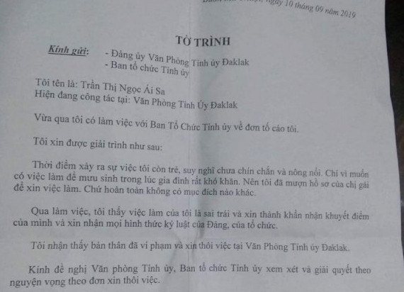 "Tôi nhận thấy bản thân đã vi phạm và xin thôi việc tại văn phòng Tỉnh ủy Đắk Lắk.", bà Sa (tên thật là Thảo) viết.
