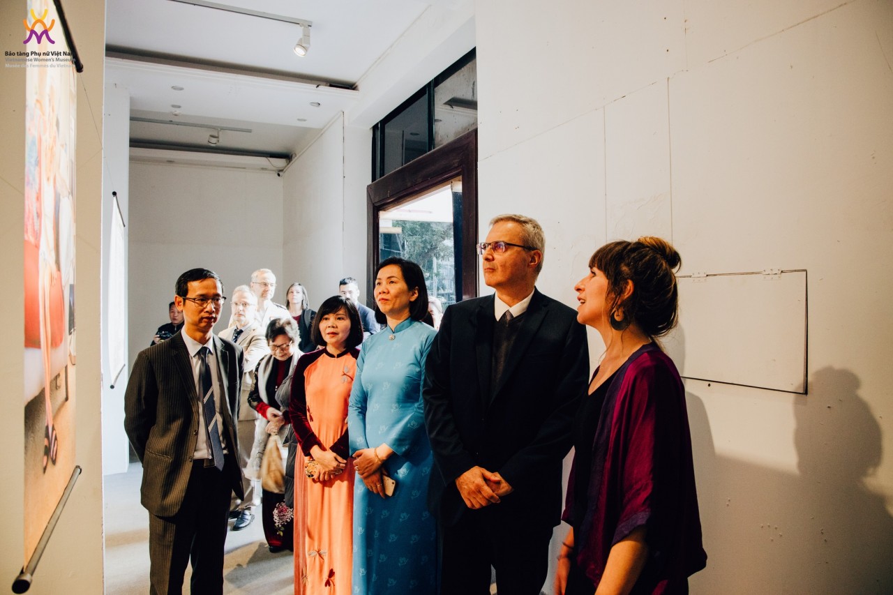 | Đại sứ Pháp tại Việt Nam Nicolas Warnery, đại diện lãnh đạo Hội Liên hiệp Phụ nữ Việt Nam, Bảo tàng Phụ nữ Việt Nam và các khách mời cắt băng khai mạc triển lãm của nhiếp ảnh gia Pháp (Ảnh: Bảo tàng Phụ nữ Việt Nam). |