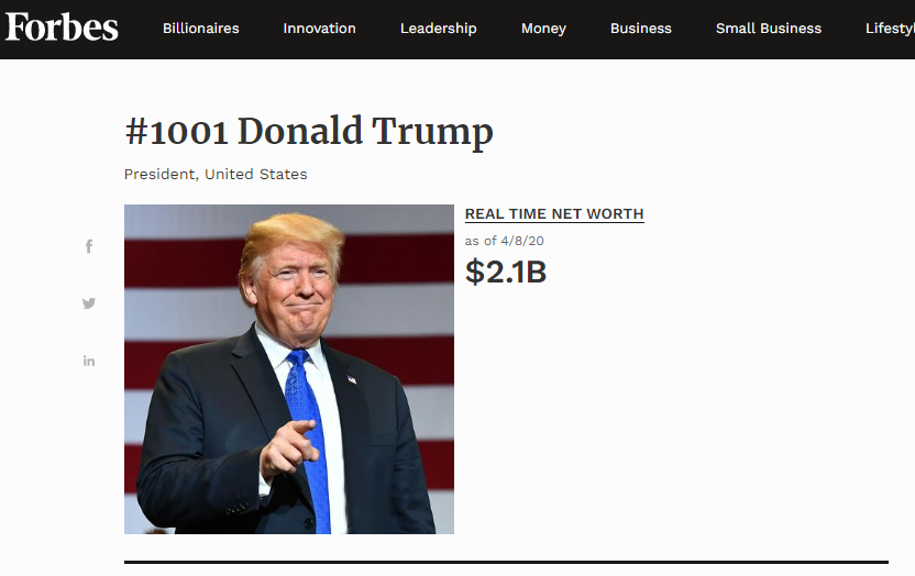 Thống kê của Forbes cho thấy, khối tài sản của Tổng thống Mỹ Donald Trump hiện là 2,1 tỷ USD. So với 3,1 tỷ USD hồi tháng 3, tài sản của nhà lãnh đạo Mỹ ...