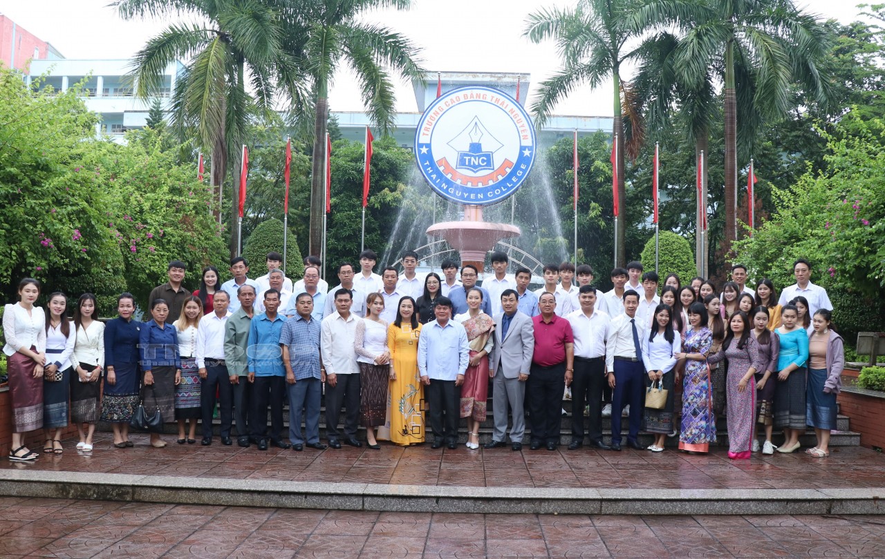 | Đoàn đại biểu tỉnh Bò Kẹo chụp ảnh lưu niệm với lưu học sinh Lào tại Trường Cao đẳng Thái Nguyên (Ảnh: Xuân Huy/ Cổng thông tin điện tử Thái Nguyên). |